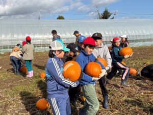 当日は(株)百商屋さんのほ場で南瓜ランタンにする南瓜選びからスタートしました。児童は青年部員の手助けを借りながら、自分で選んだ抱えきれないほど大きな南瓜を自慢し合ったりと楽しそうに収穫していました。