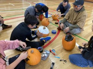 収穫後は小学校体育館に移動し、カラーペンやガムテープを使用しながら思い思いのやり方で個性豊かな南瓜ランタンが完成しました。